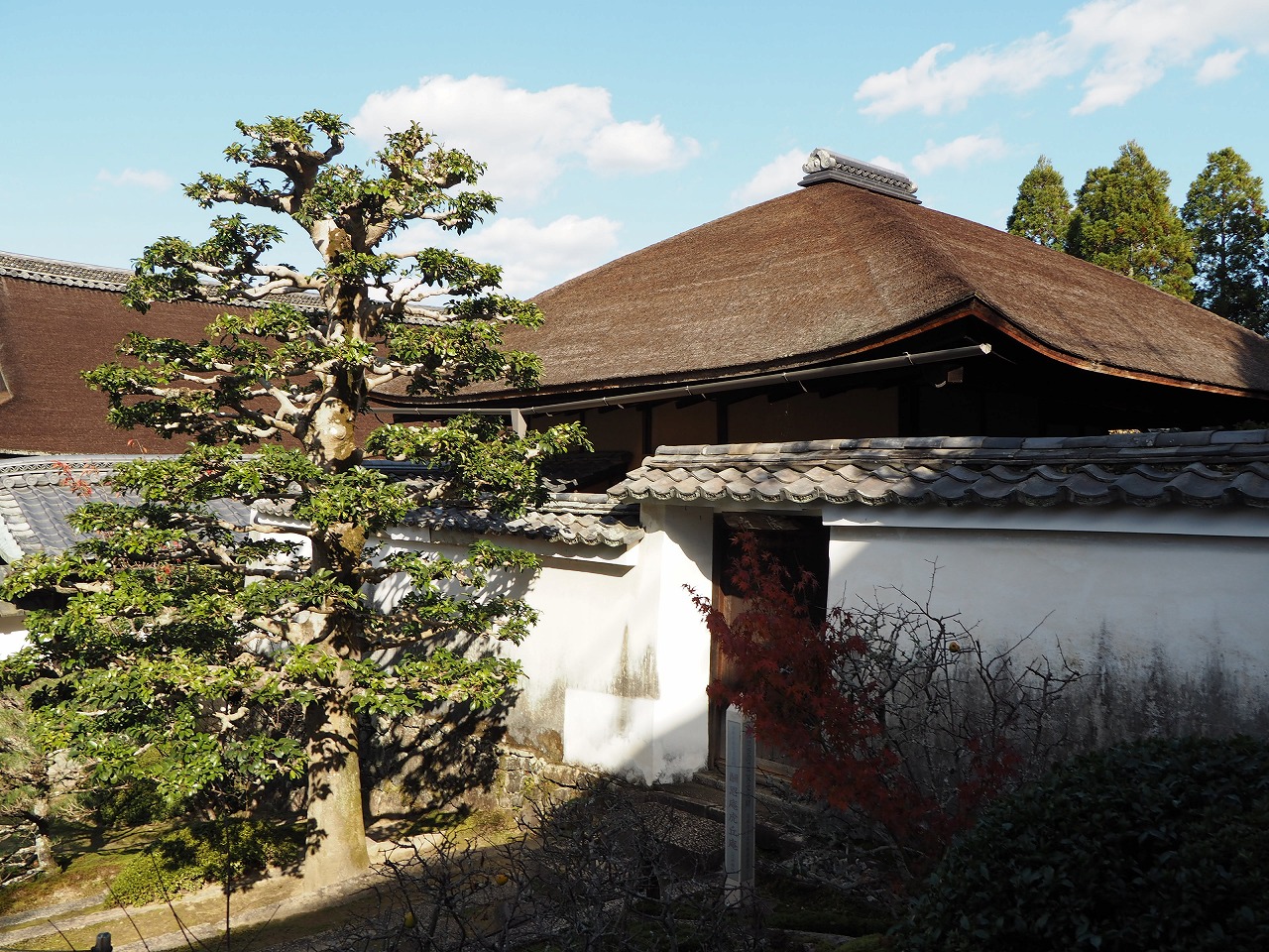 慶安三年(一六五〇)築、国の重要文化財です。浴室向かいで受け付けを済ませ、右に折れ西の方向に進むと一休宗純の陵墓があります。先ほども触れたように、陵墓のため内部に立ち入ることはできませんが、菊の透かし彫りの門越しに中をのぞくと、左右に大きく張り出した特徴的な屋根を持つお堂の手前に、枯山水庭園が見えます。一休と親交のあった村田珠光の作です。