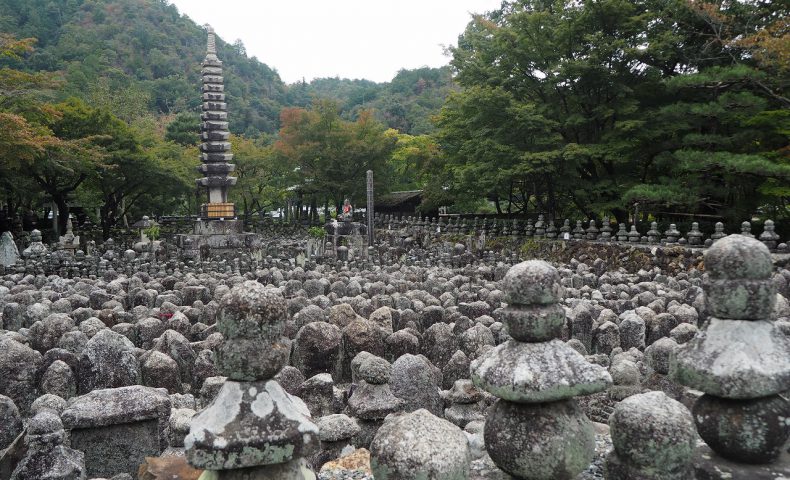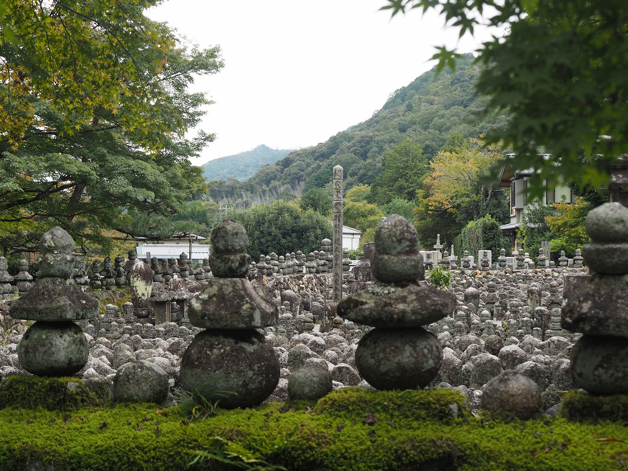 今回向かった化野は嵯峨野にある小倉山の麓の野一帯を指し、化野の「あだし」は「徒し」「空し」、つまりむなしい、実体がない、変わりやすいという意味を持ちます。平安時代庶民は死すると都の周辺に設けられた葬送の地に野ざらしの状態で置かれていました。いわゆる風葬ですが、風にさらされ次第に自然に還っていく土地、無常の地ということで化野という地名が生まれたのでしょう。