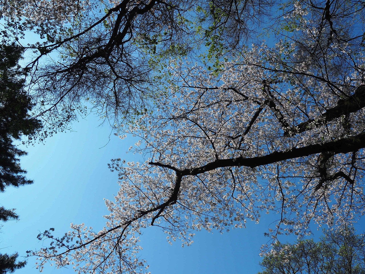 森に咲く桜は自由気ままに枝を延ばし空を覆っています。