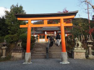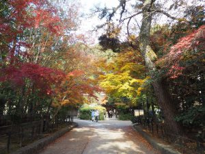 宇治上神社の参道は、秋には極彩色に彩られます。ゆっくり進むと石橋の先に控えめな表門が現れます。
