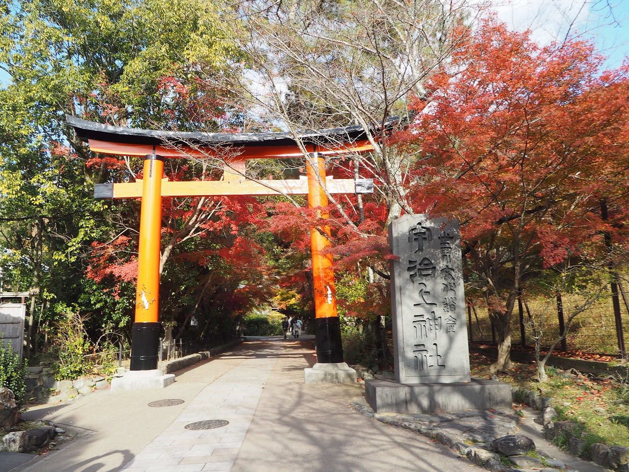 宇治川に面した通りに朱色の鳥居が立っているのが宇治神社です。