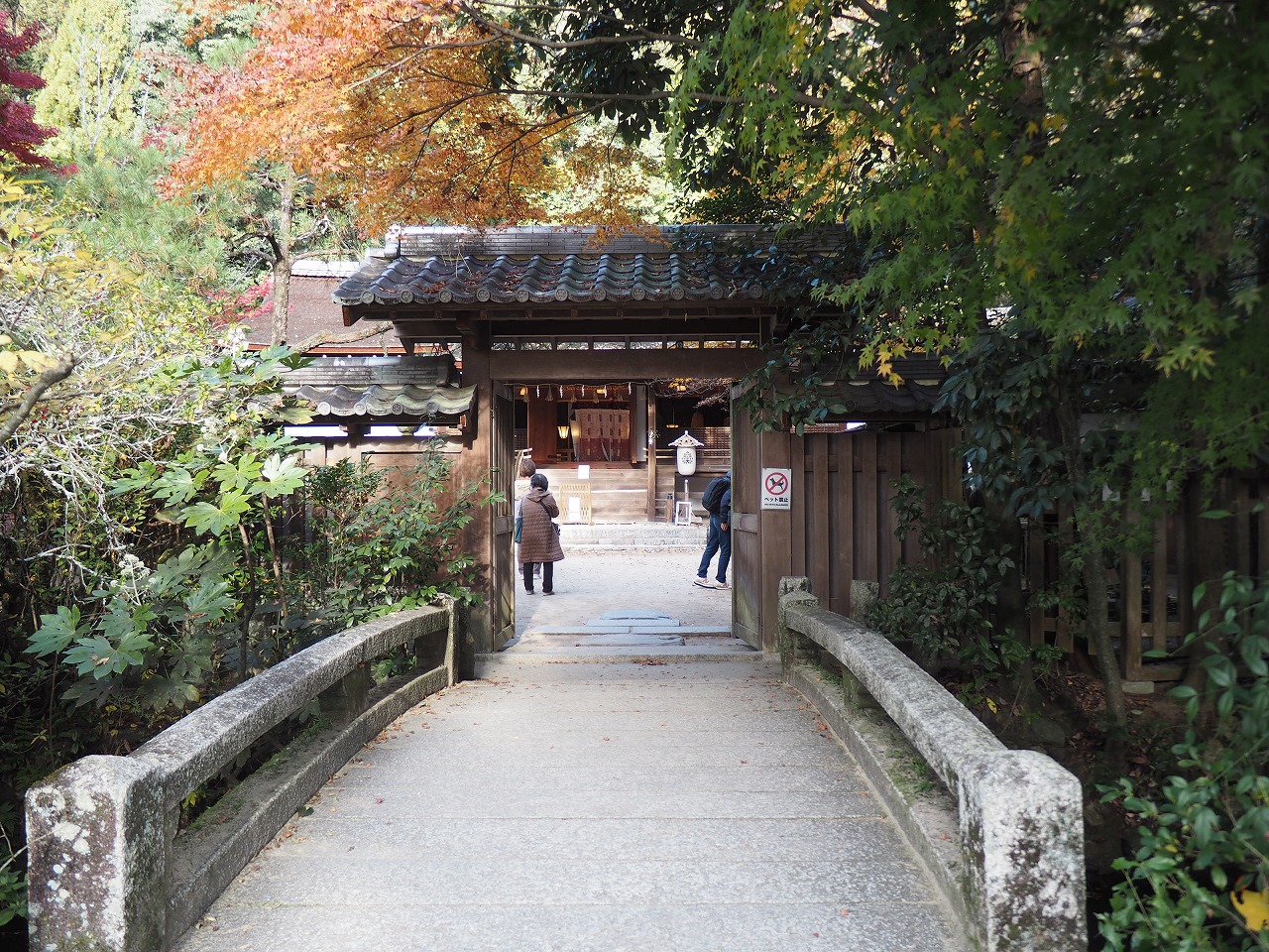 宇治上神社の参道は、秋には極彩色に彩られます。ゆっくり進むと石橋の先に控えめな表門が現れます。
