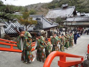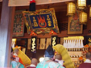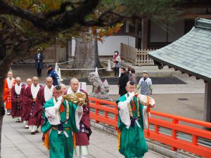 数十分間拝殿で雅楽が奏された後、再び山伏の先導で僧侶が入場します。