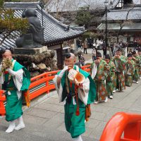 一同が拝殿に入ると法要が始まりました。しばらく荘厳な雰囲気で法要が進行しますが、突如導師の力強い声を合図に大般若経六百巻を転読する大般若転読法要に移ります。僧侶らが見るも鮮やかに経巻をアコーディオンのようにめくりながら転読し最後経机に大きな音でたたきつけるということを繰り返すのですが、拝殿の外にいてもその迫力に圧倒されます。力強いこの法要は災いや悪を祓い、招福、平和、五穀豊穣を願うものとのことで、まさにこの場に身を置くことで悪いものが祓われた感じがします。