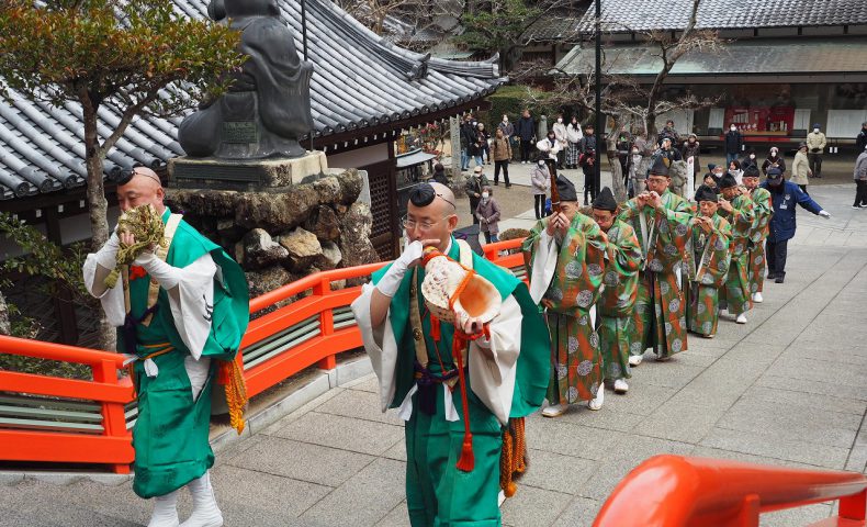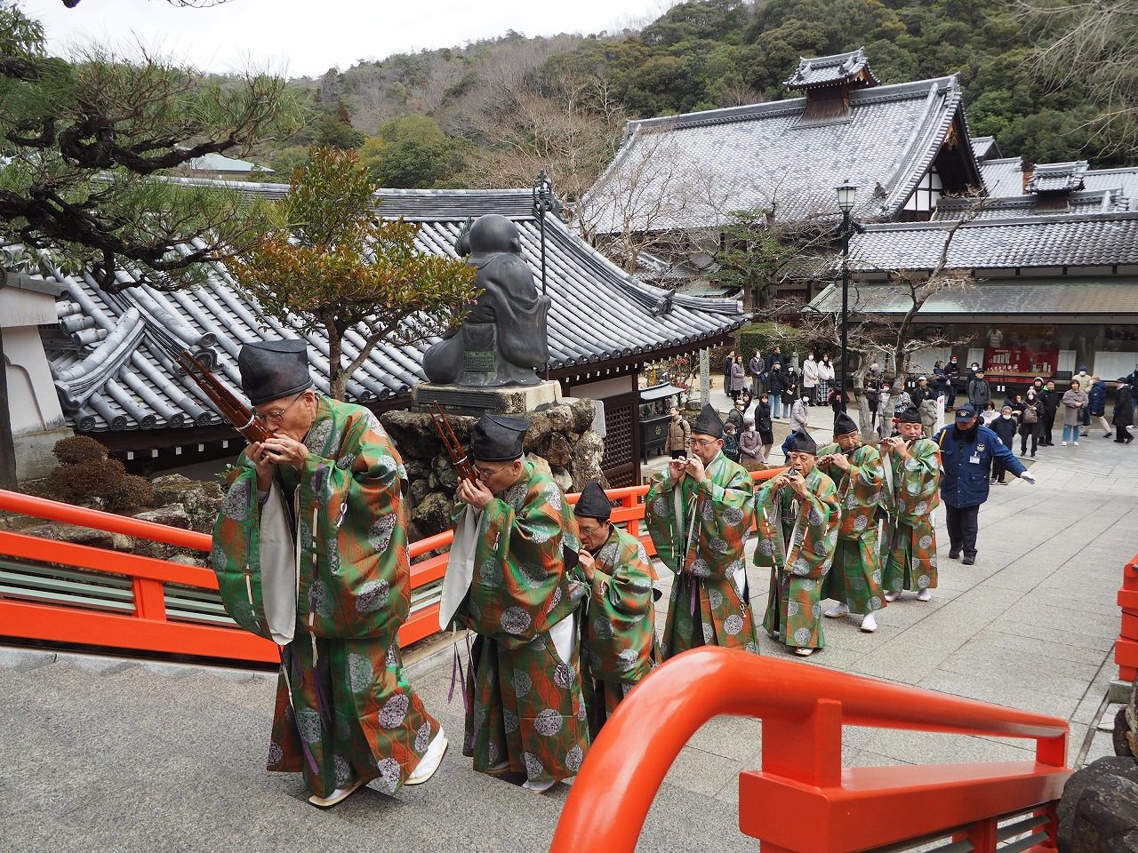 お参りを済ませ境内で待っていると、しばらくして法螺貝を吹く山伏を先頭に、雅楽隊が笙や笛を奏しながら石段を上がってきました。