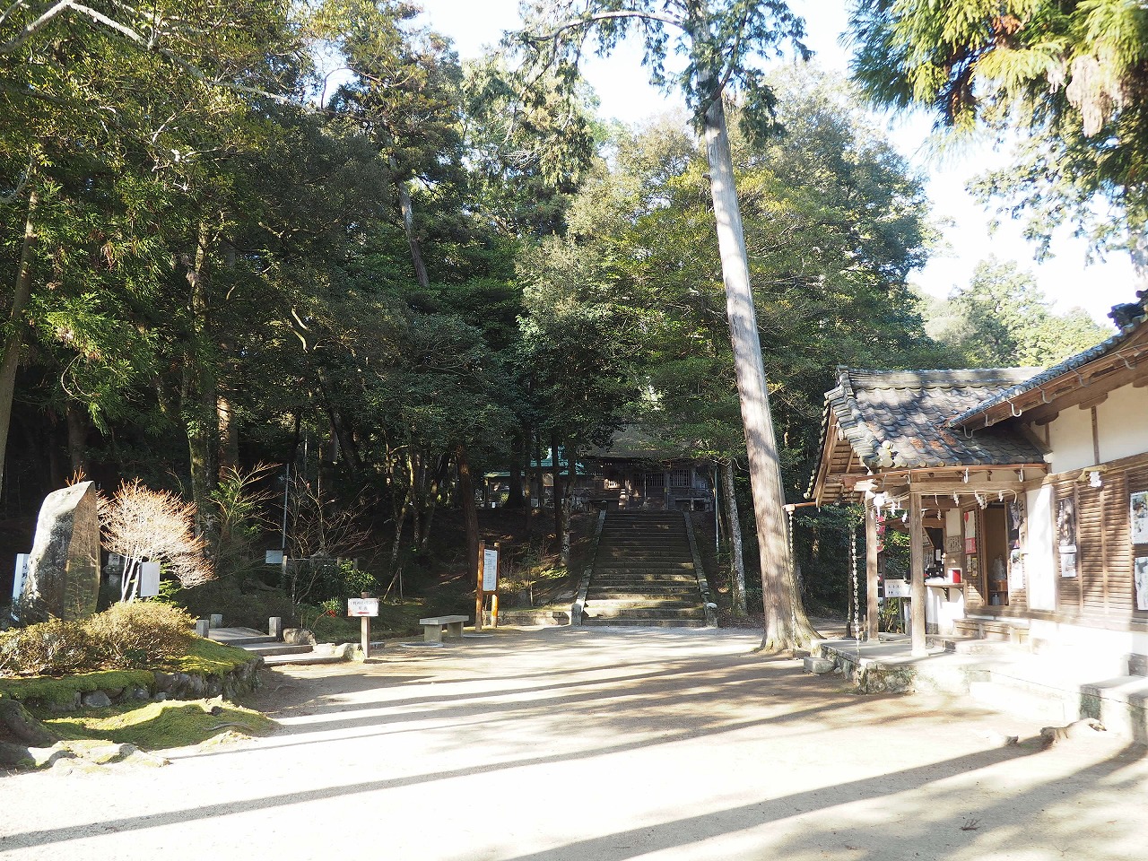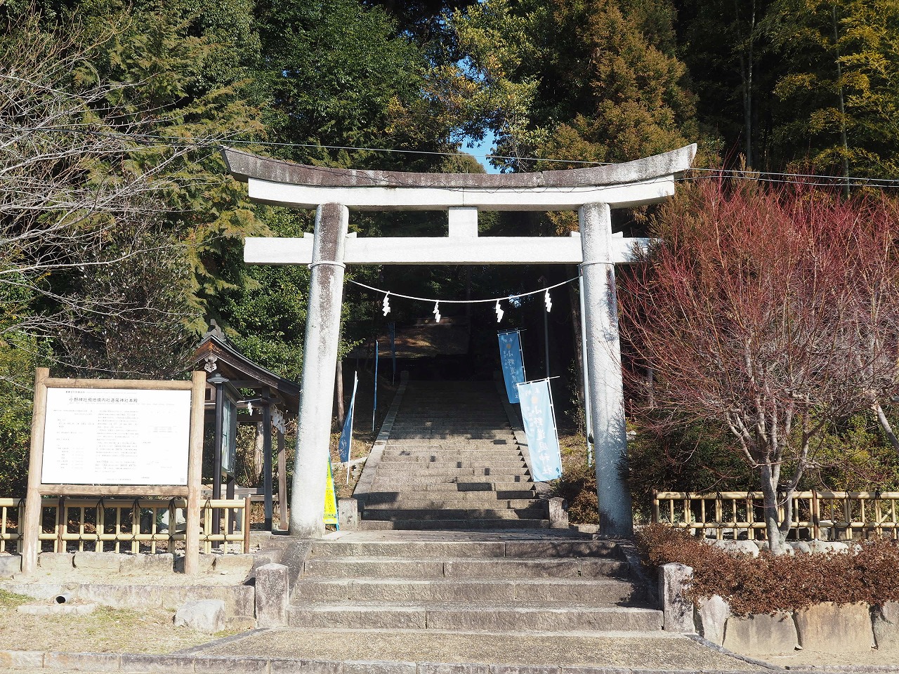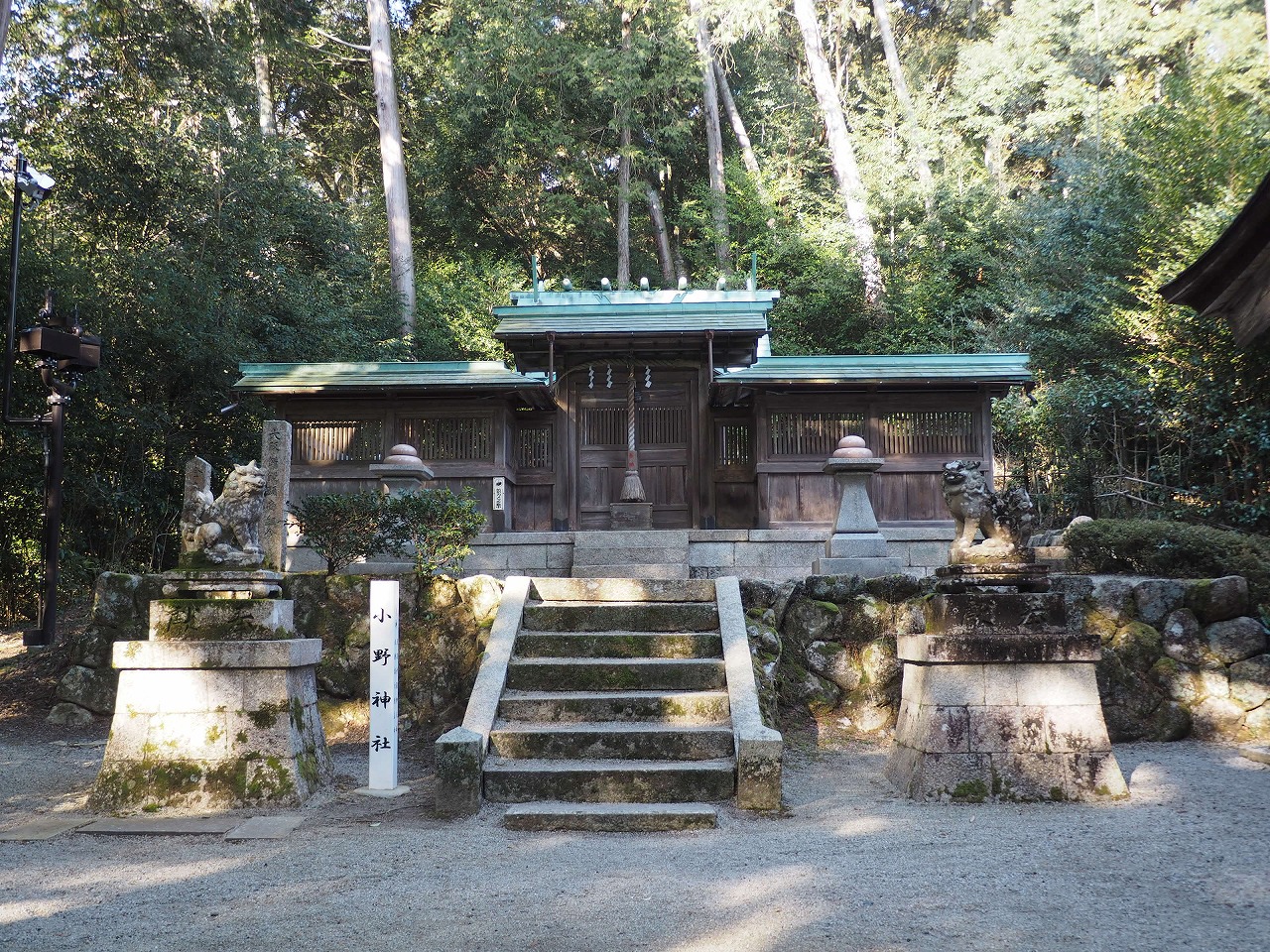 冷たく澄んだ空気が心地よく、深呼吸すると心身が洗われるようです。石段の上に見える社殿が小野神社です。