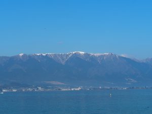 琵琶湖の西は現在その半分近くを大津市が占めています。昭和になってから徐々に進んだ合併のためで、以前は大津市の周辺に膳所町、瀬田町、坂本村、堅田町などがあり、それぞれに固有の歴史を有してきました。小野神社の周辺はかつて志賀町と呼ばれていた地域ですが、志賀町自体も昭和三十年に和邇村、木戸村、小松村が合併して出来た町です。位置としては、琵琶湖西岸のちょうど真ん中あたりになります。下は対岸から見た和邇の周辺で、湖岸の左に見える緑色の建物後方の高台に今回訪ねる小野神社などが鎮座しています。